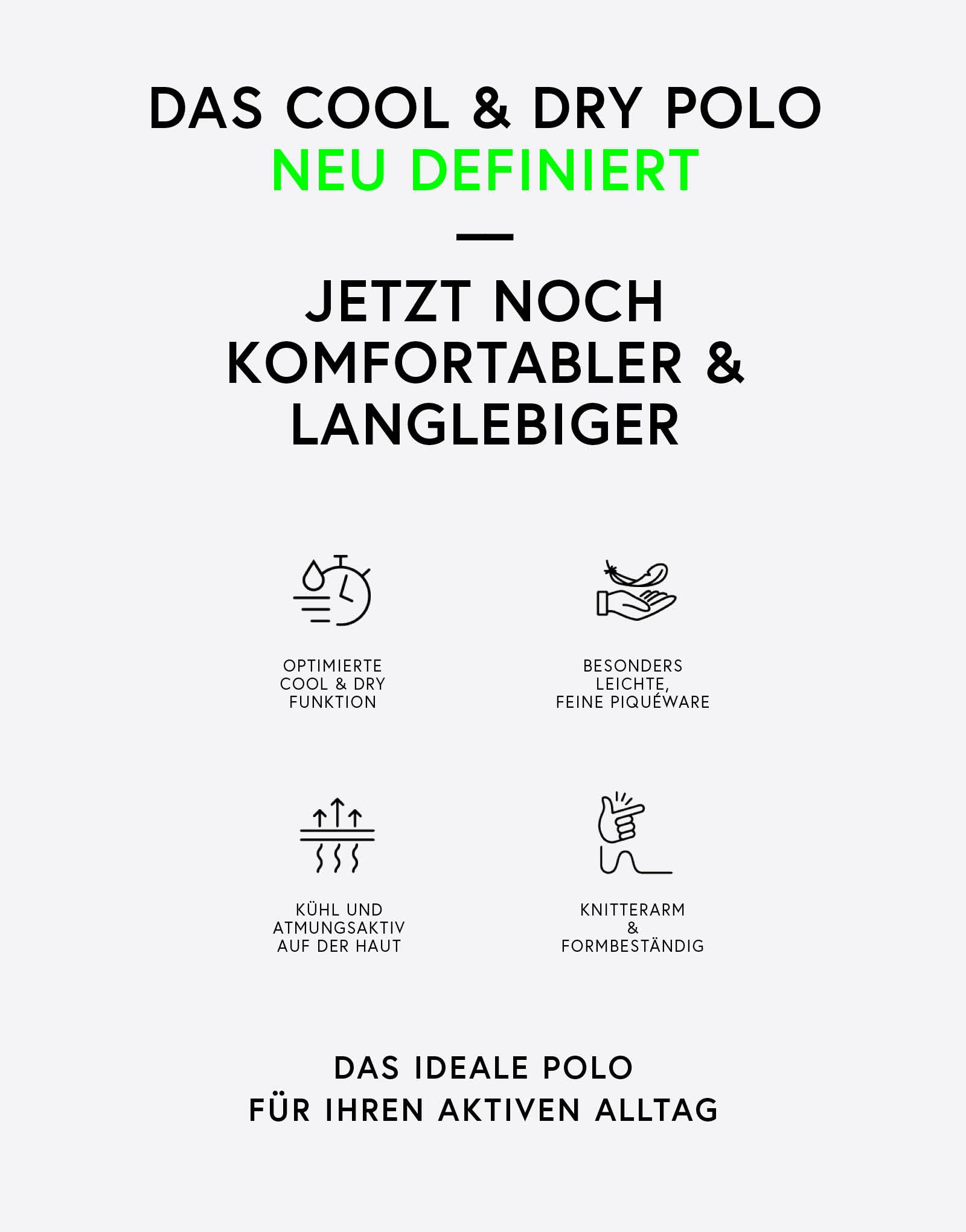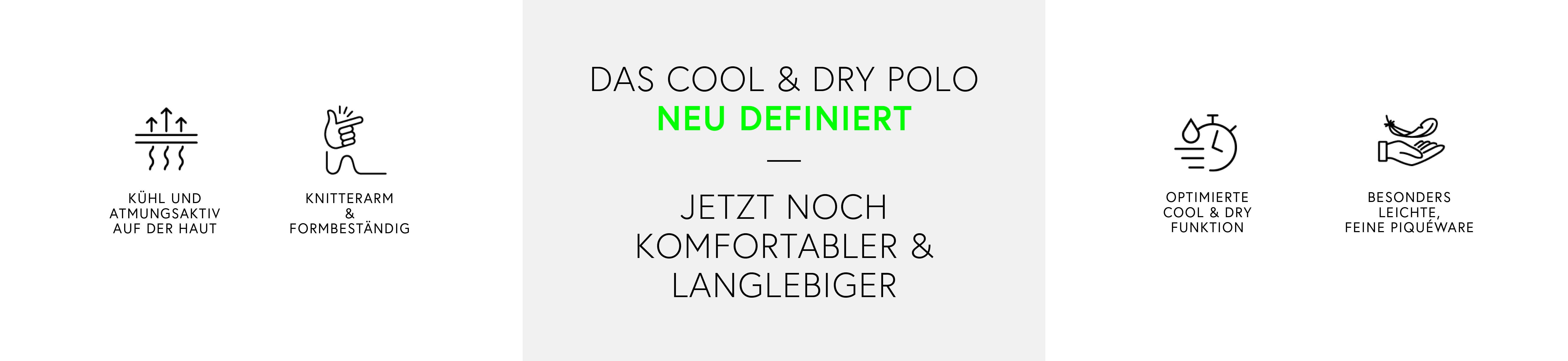 Unser Polo kombiniert feine Baumwolle außen, mit leichten synthetischen Fasern innen, für ein besonders weiches Tragegefühl. Die spezielle Herstellung des Materials, Plattierung genannt, sorgt für den optimierten COOL & DRY Effekt, der Feuchtigkeit nach außen transportiert und ein kühles, angenehmes Hautgefühl garantiert.
