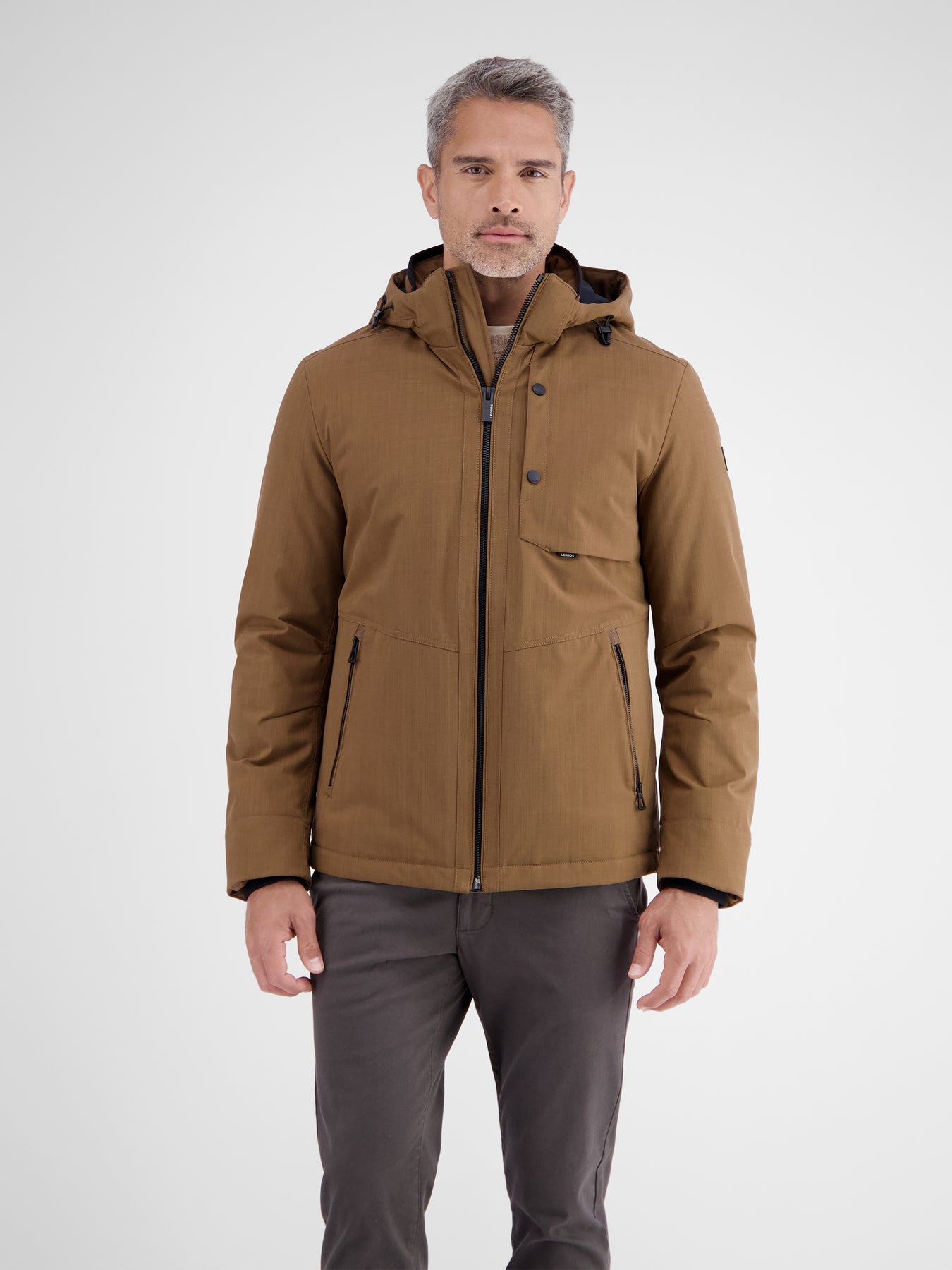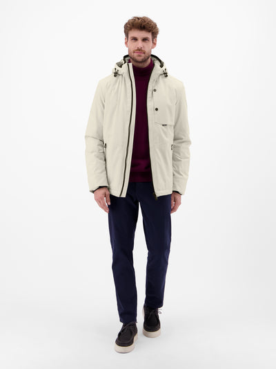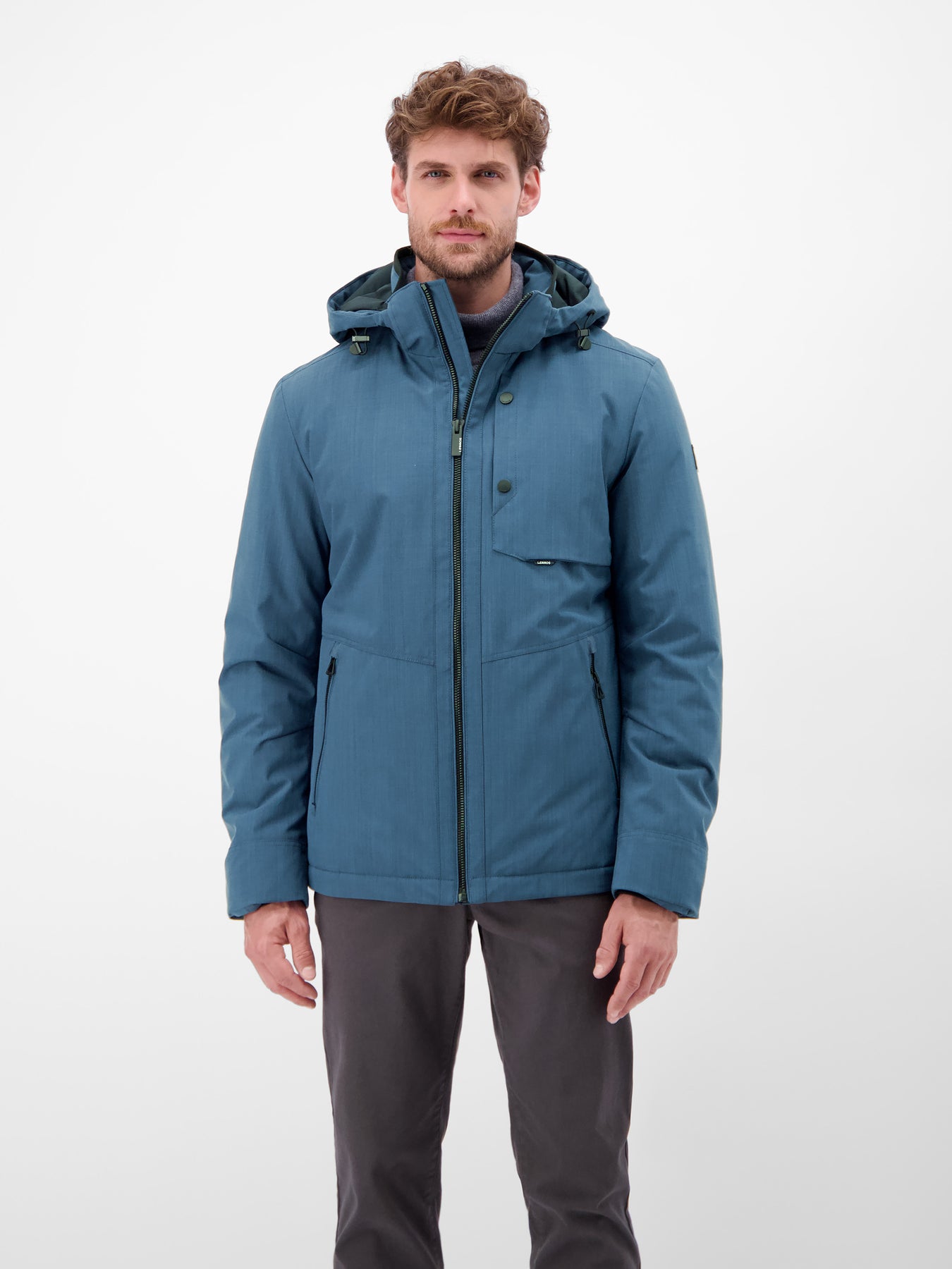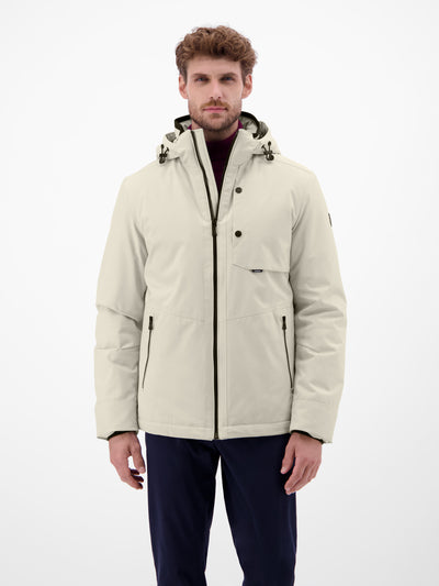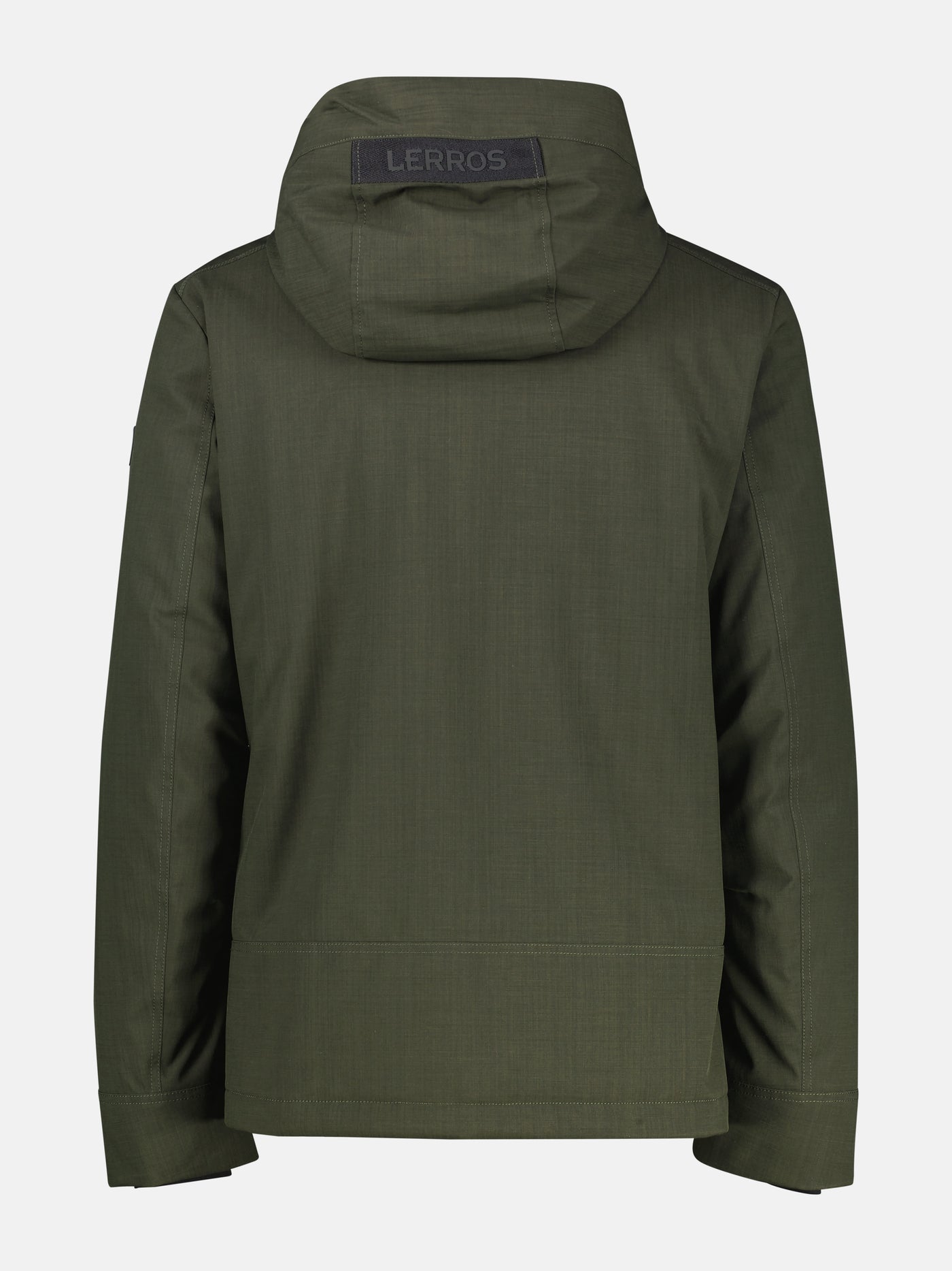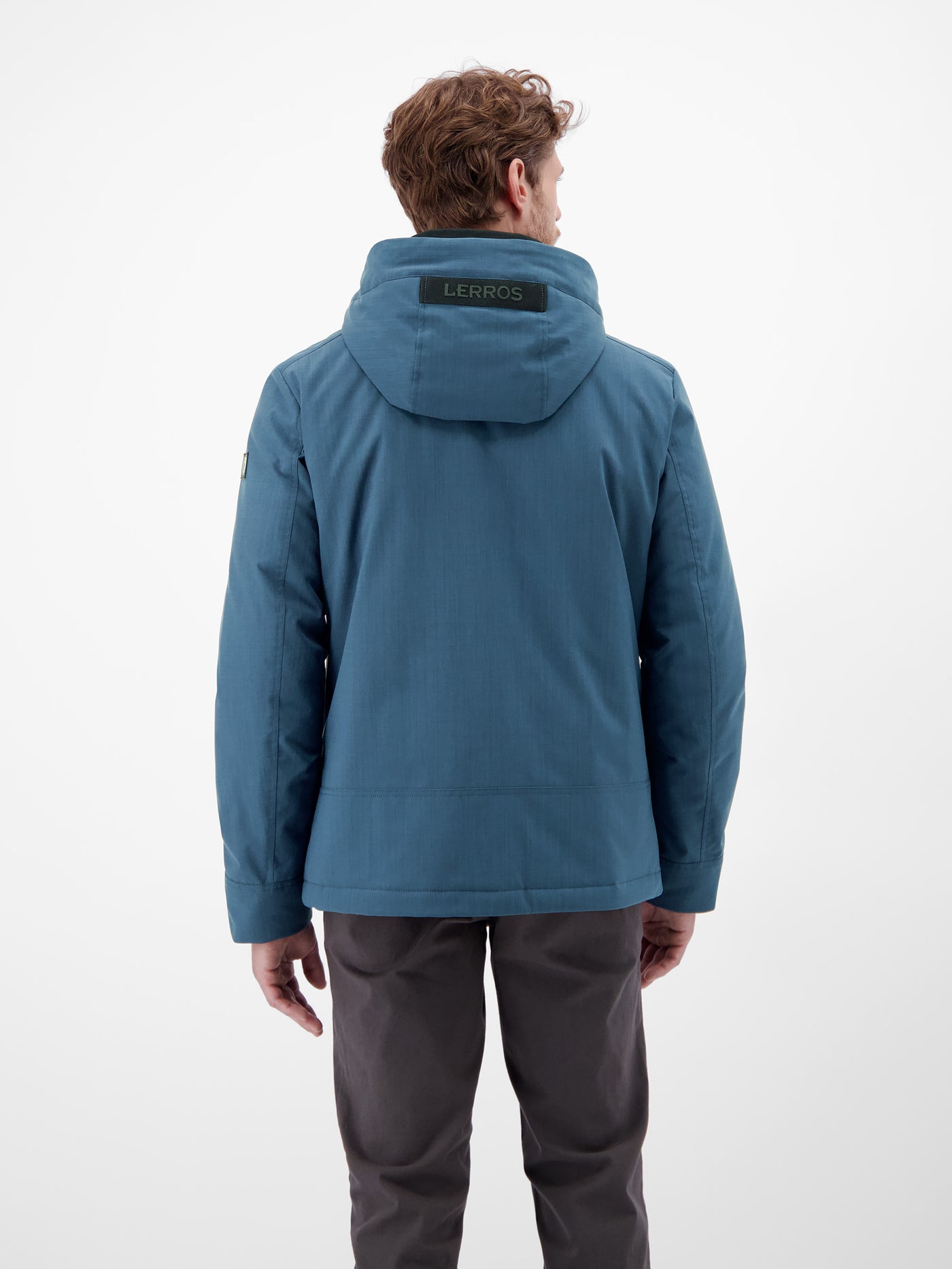 This men's blouson jacket with a detachable hood from LERROS impresses with its simple, sporty look. The water- and wind-resistant material leaves nothing to be desired in terms of comfort and wearability. The tonal details and the zippered hand pockets skillfully round out the design of this outdoor jacket.Pflege: