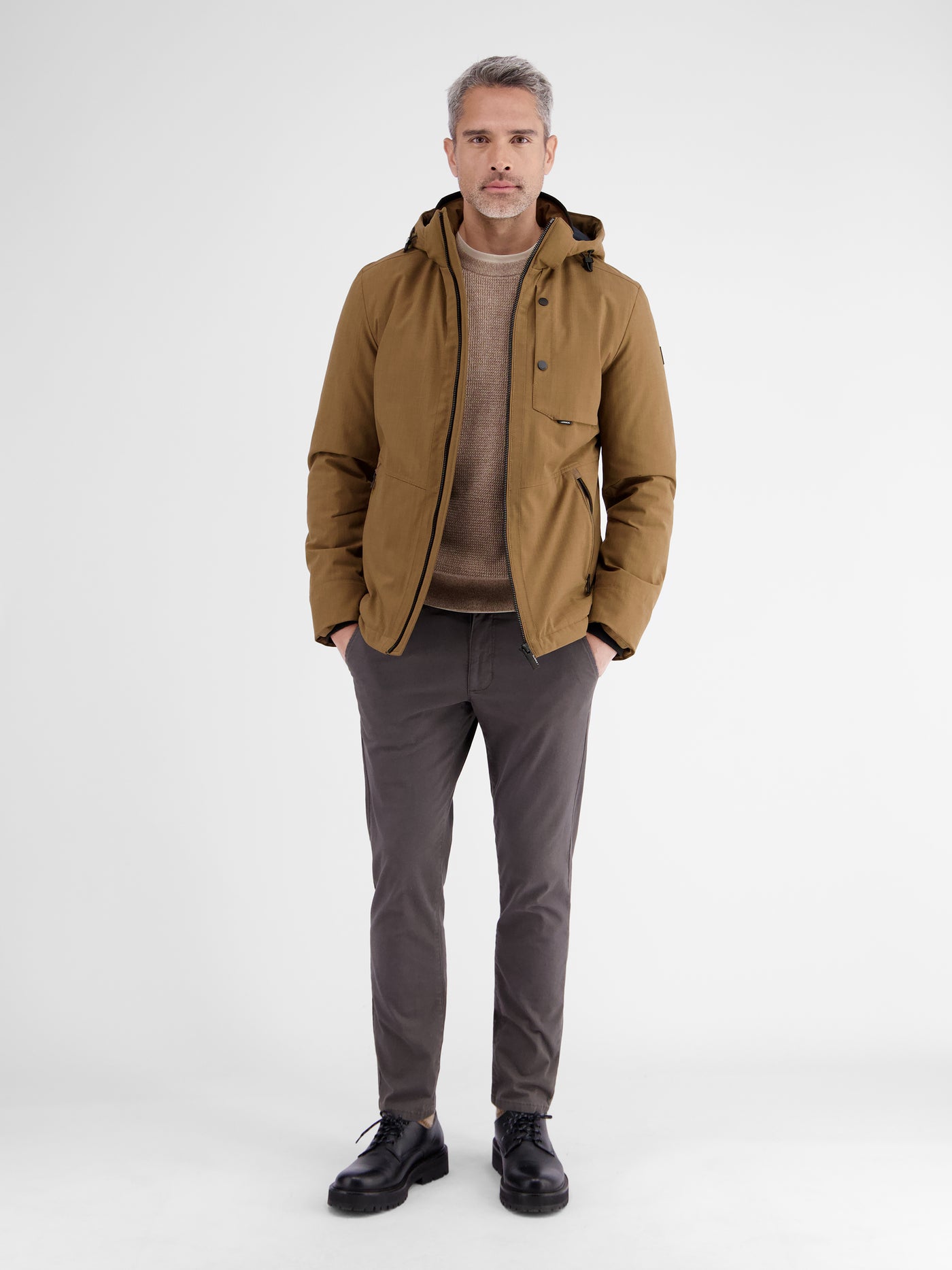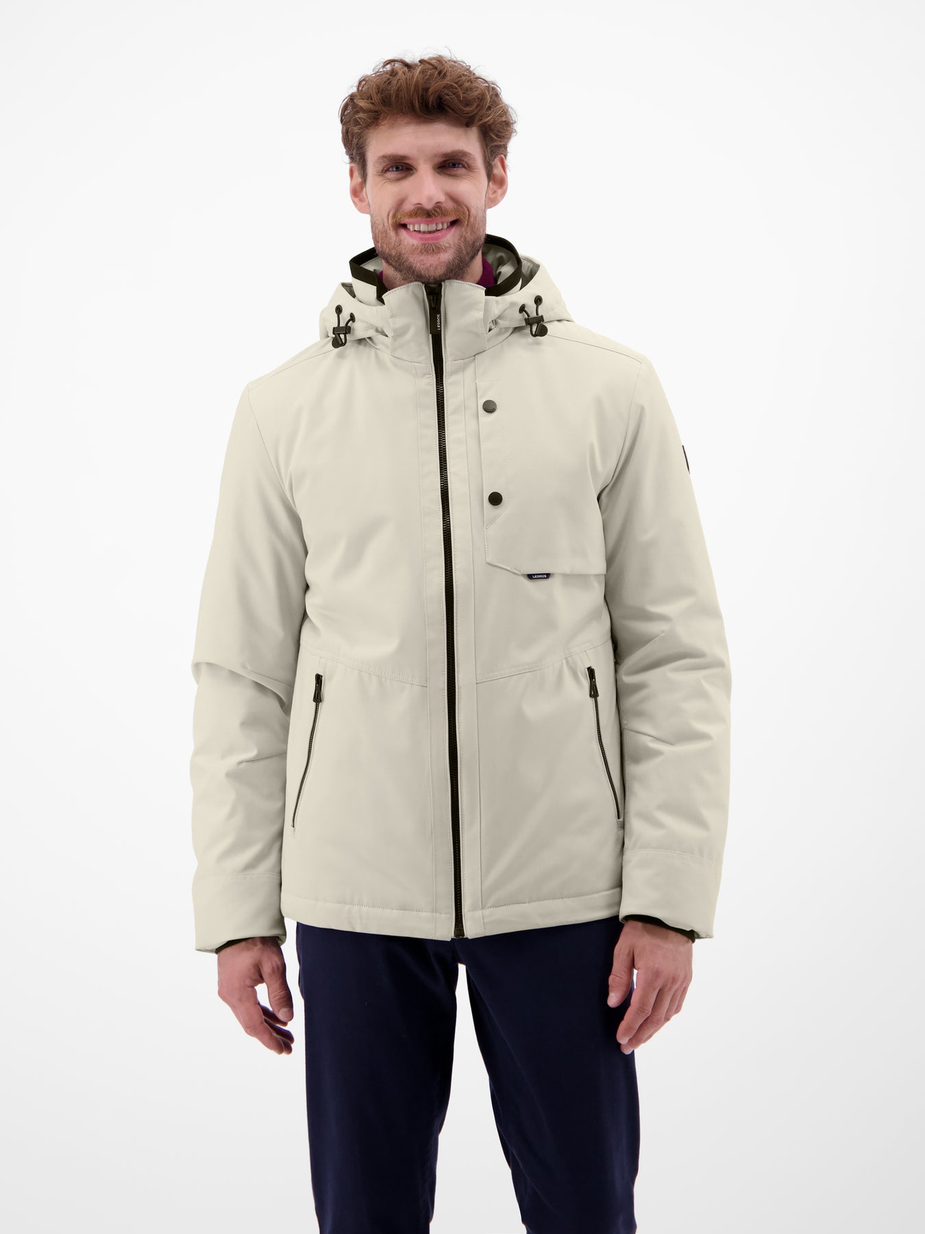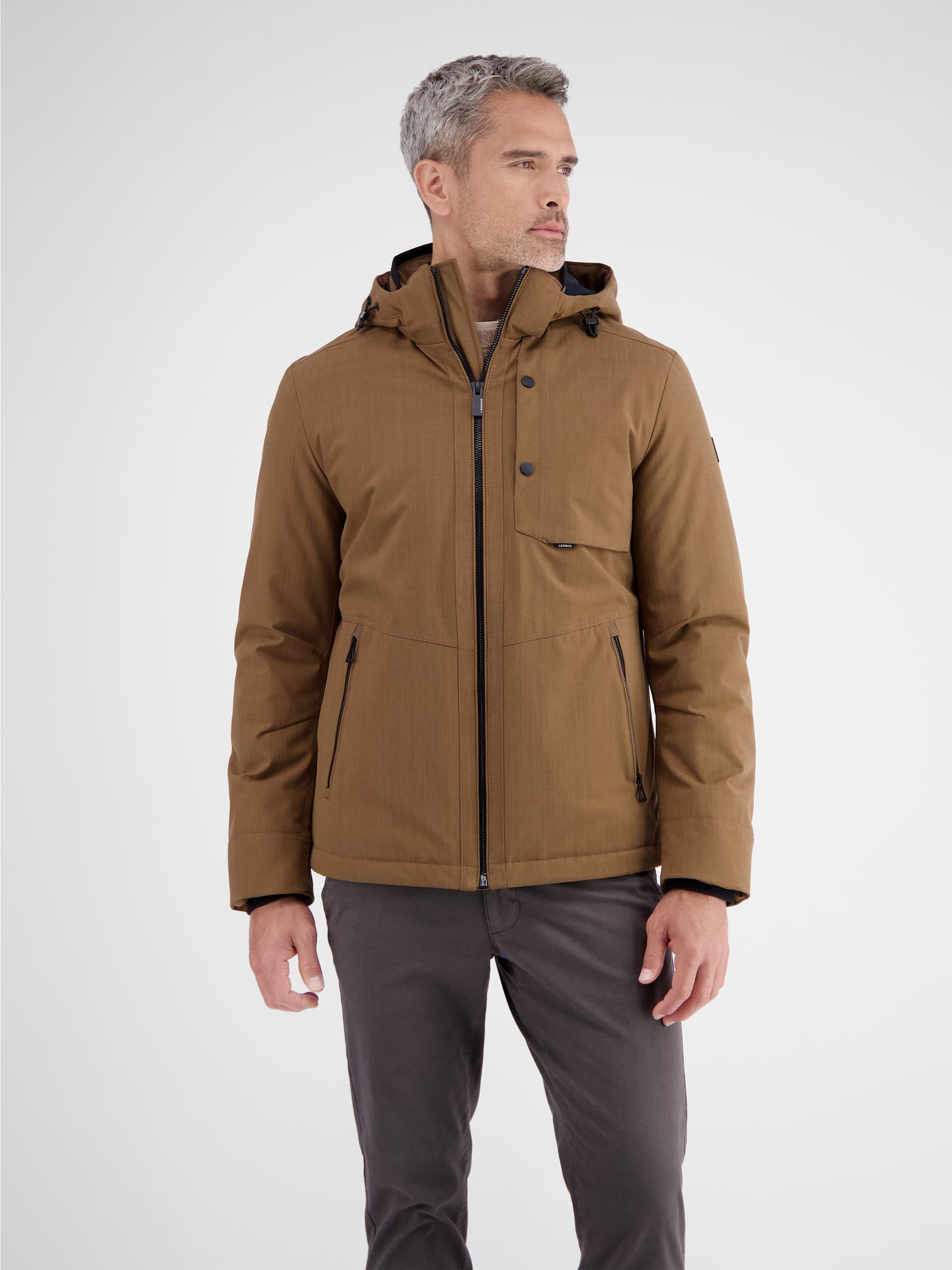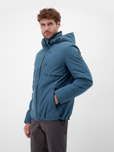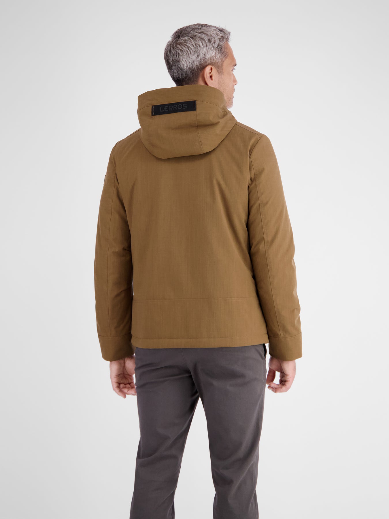 This men's blouson jacket with a detachable hood from LERROS impresses with its simple, sporty look. The water- and wind-resistant material leaves nothing to be desired in terms of comfort and wearability. The tonal details and the zippered hand pockets skillfully round out the design of this outdoor jacket.Pflege: