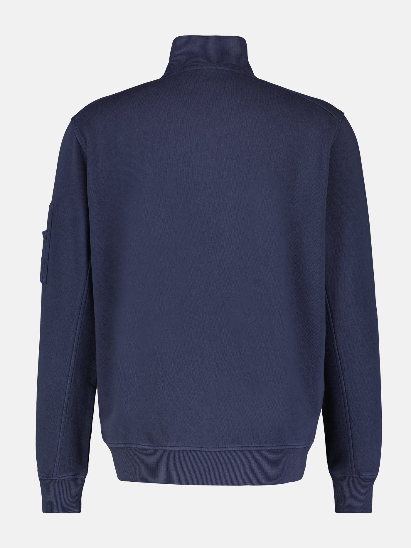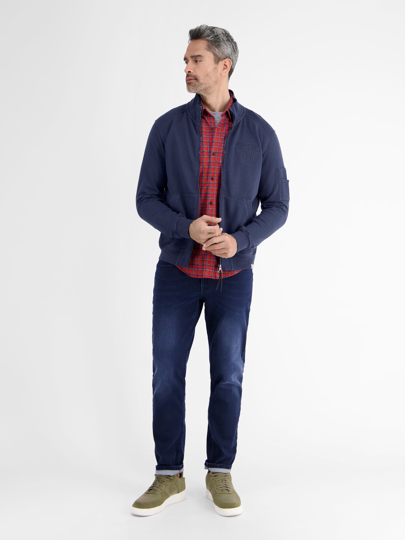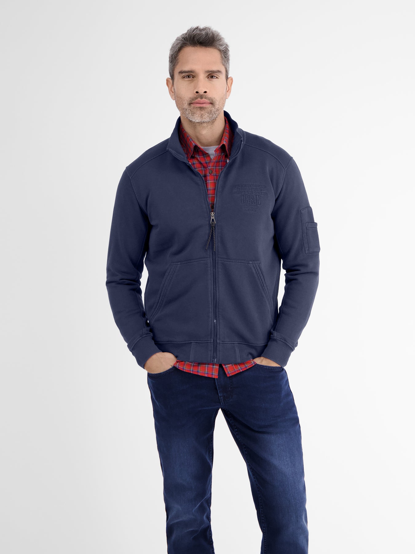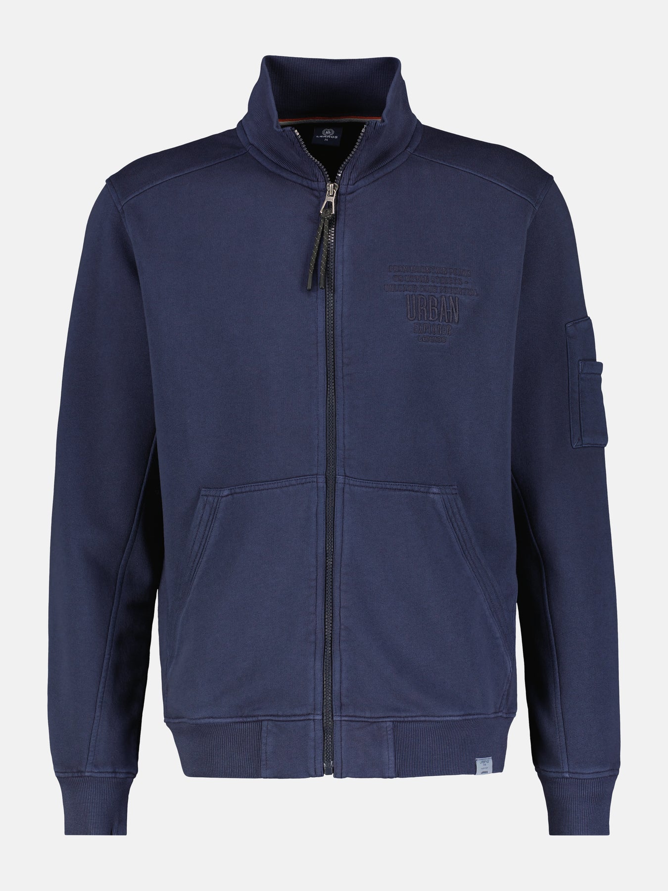 Fashionable demands and comfort come together in this LERROS sweat jacket. The ribbed stand-up collar, the kangaroo pockets and the appliqué complete the casual and sporty design.