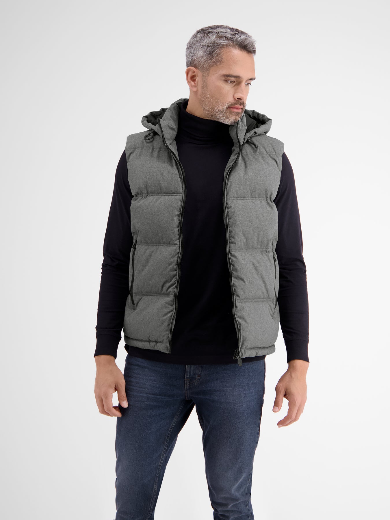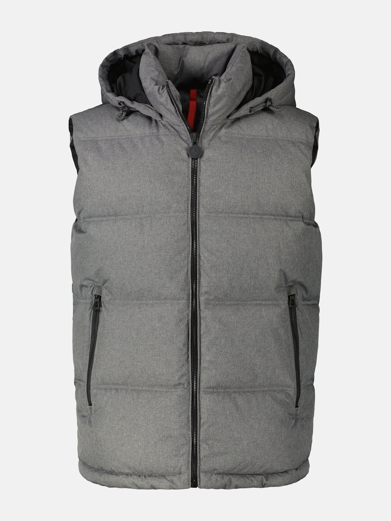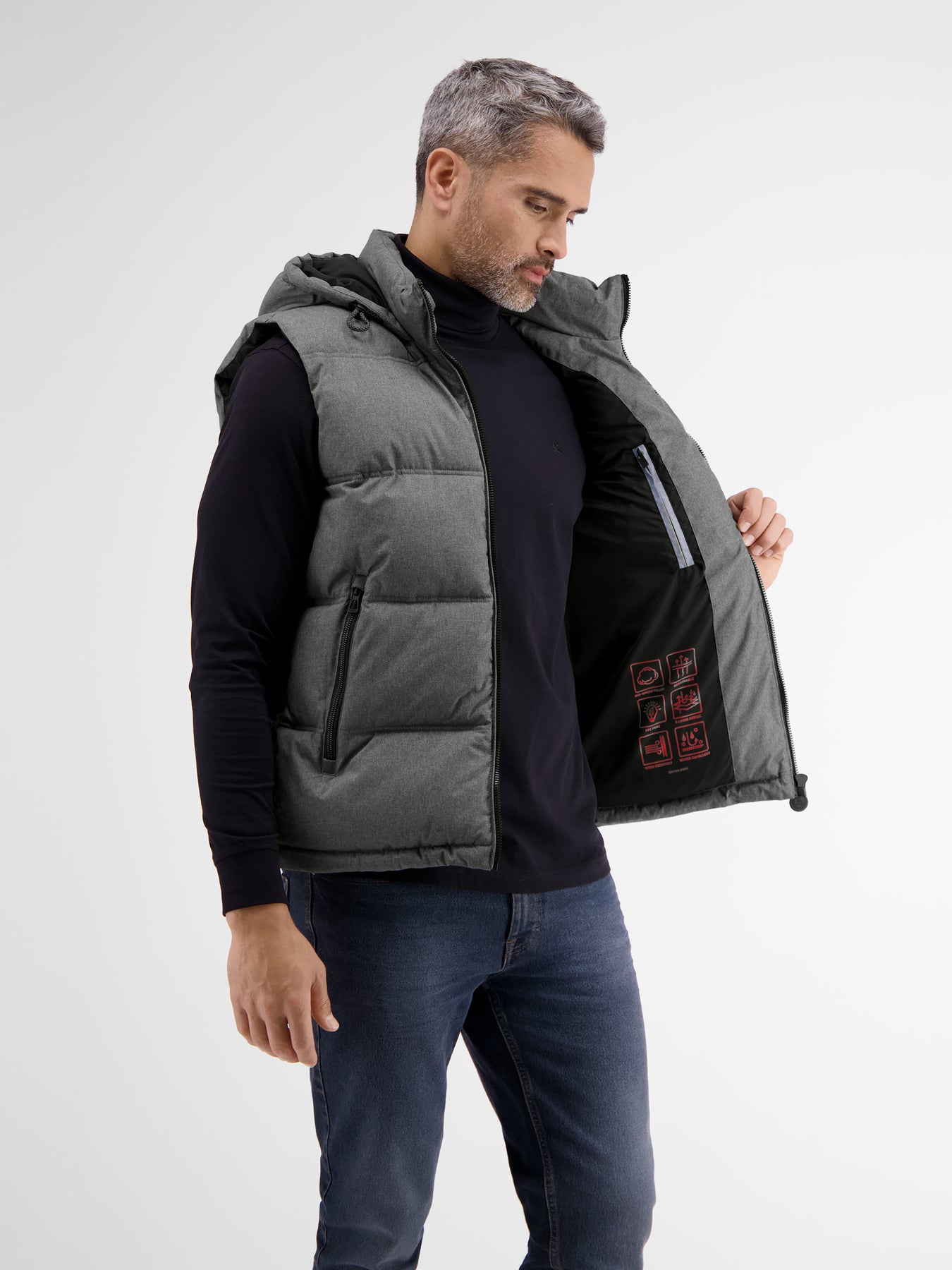 This quilted vest from LERROS is an established essential for the autumn-winter season - here in a fashionable wool look! The full-zip closure, the stand-up collar with hood, the side pockets and the fashionable, wide stitching characterize the jacket, as do the functional details such as the water- and wind-repellent breathability.Care: