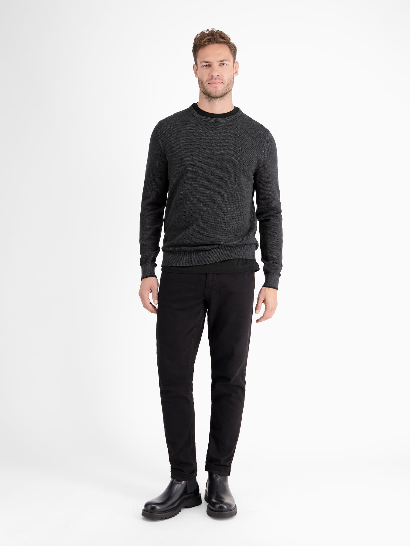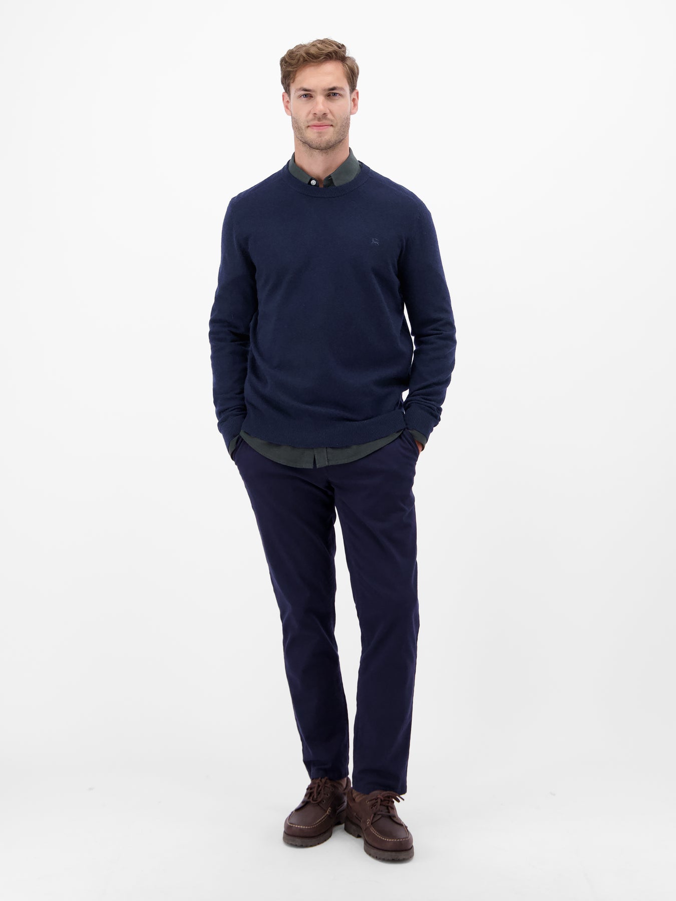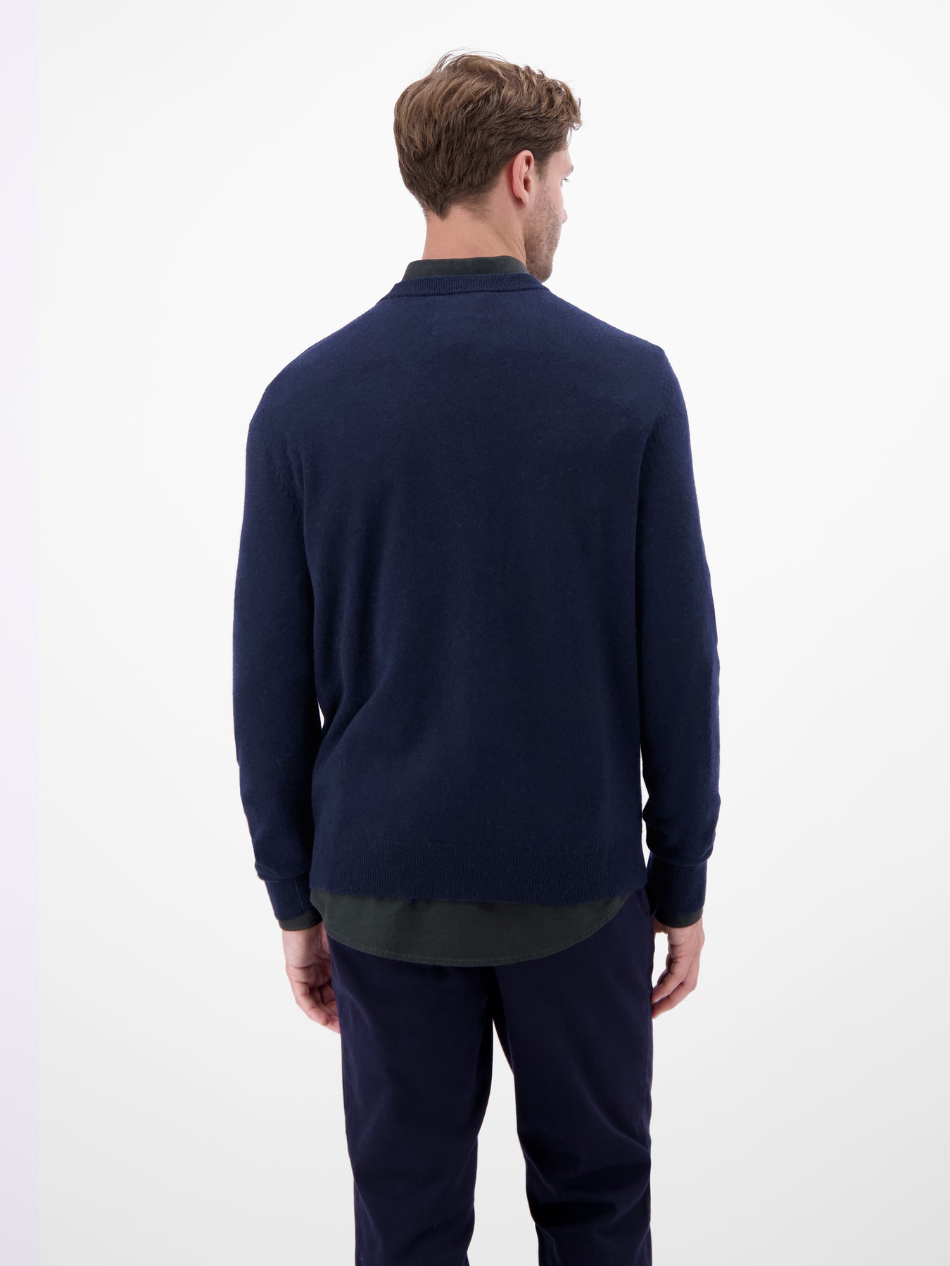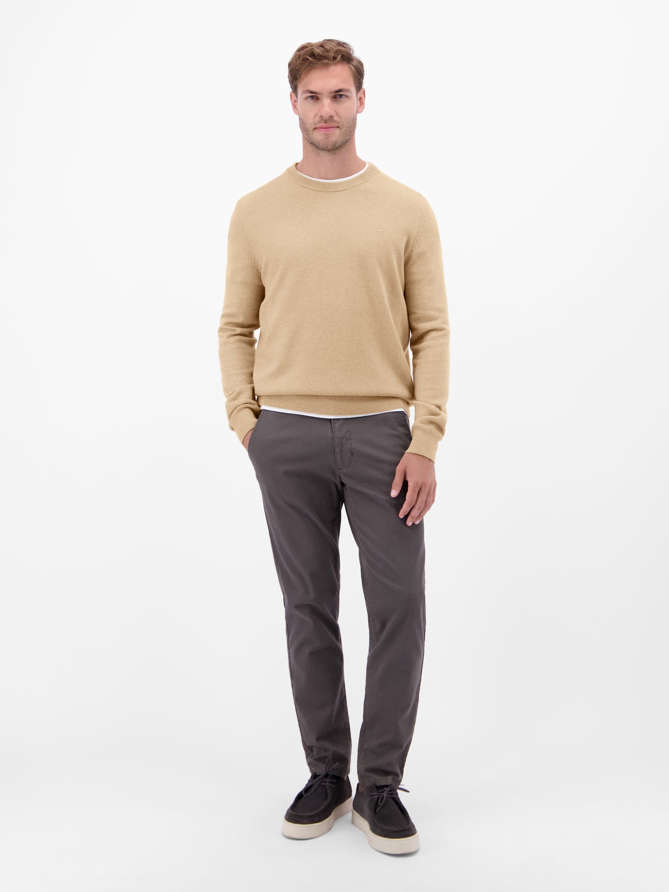 This finely knitted crew neck sweater exudes timeless class. The refined combination of pure wool and fine cashmere gives the LERROS knit sweater a pleasantly soft feel and an elegant, matte finish, perfect for men with a sense of quality and style. The classic crew neck, finely ribbed trims, and a modern, well-defined fit create a sophisticated look that blends effortlessly into any wardrobe. Whether worn on its own or layered under a blazer or coat, this sweater always looks confident, never over the top.Care: