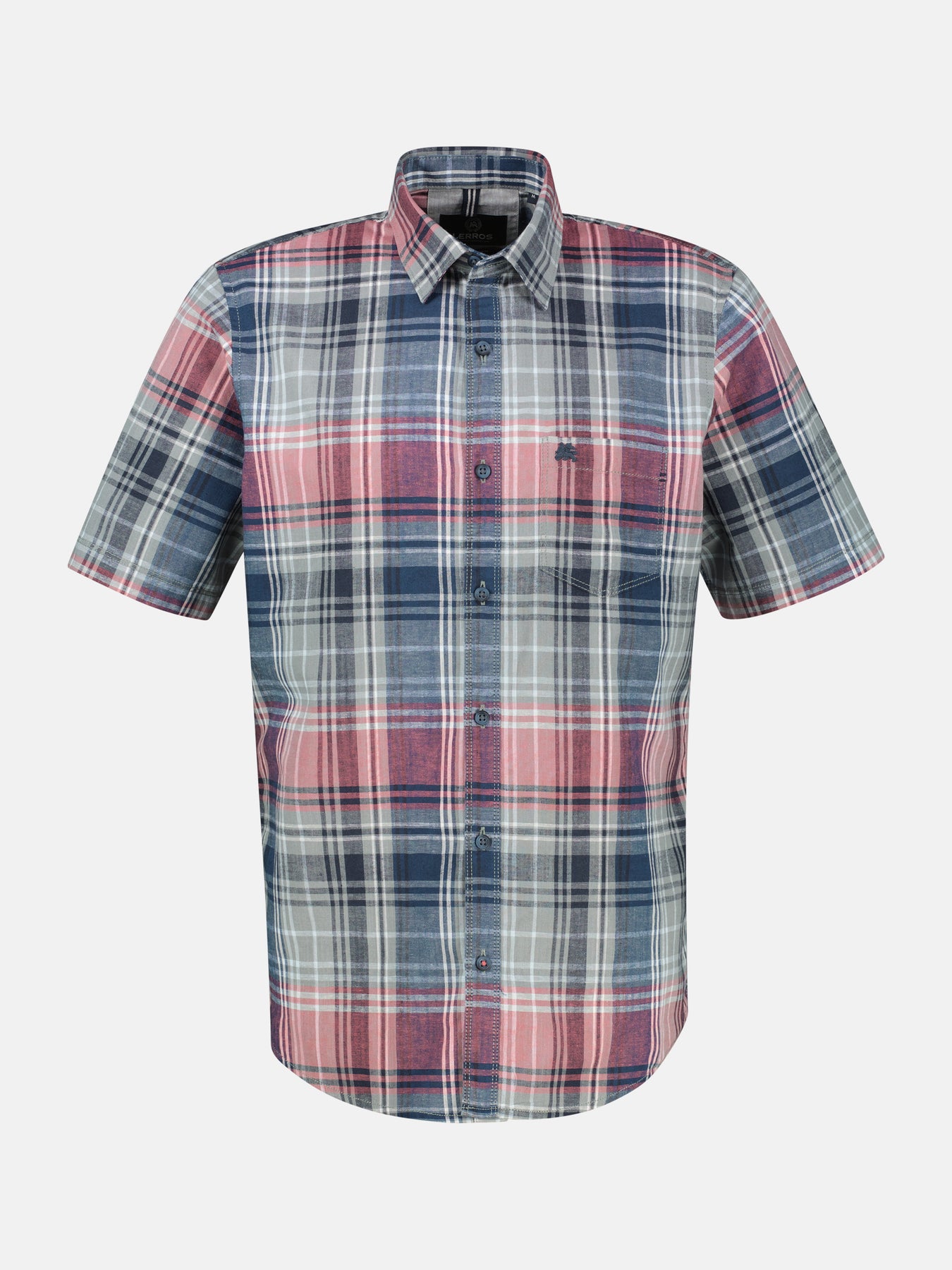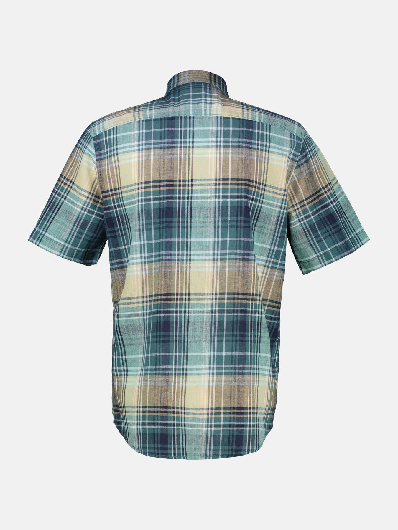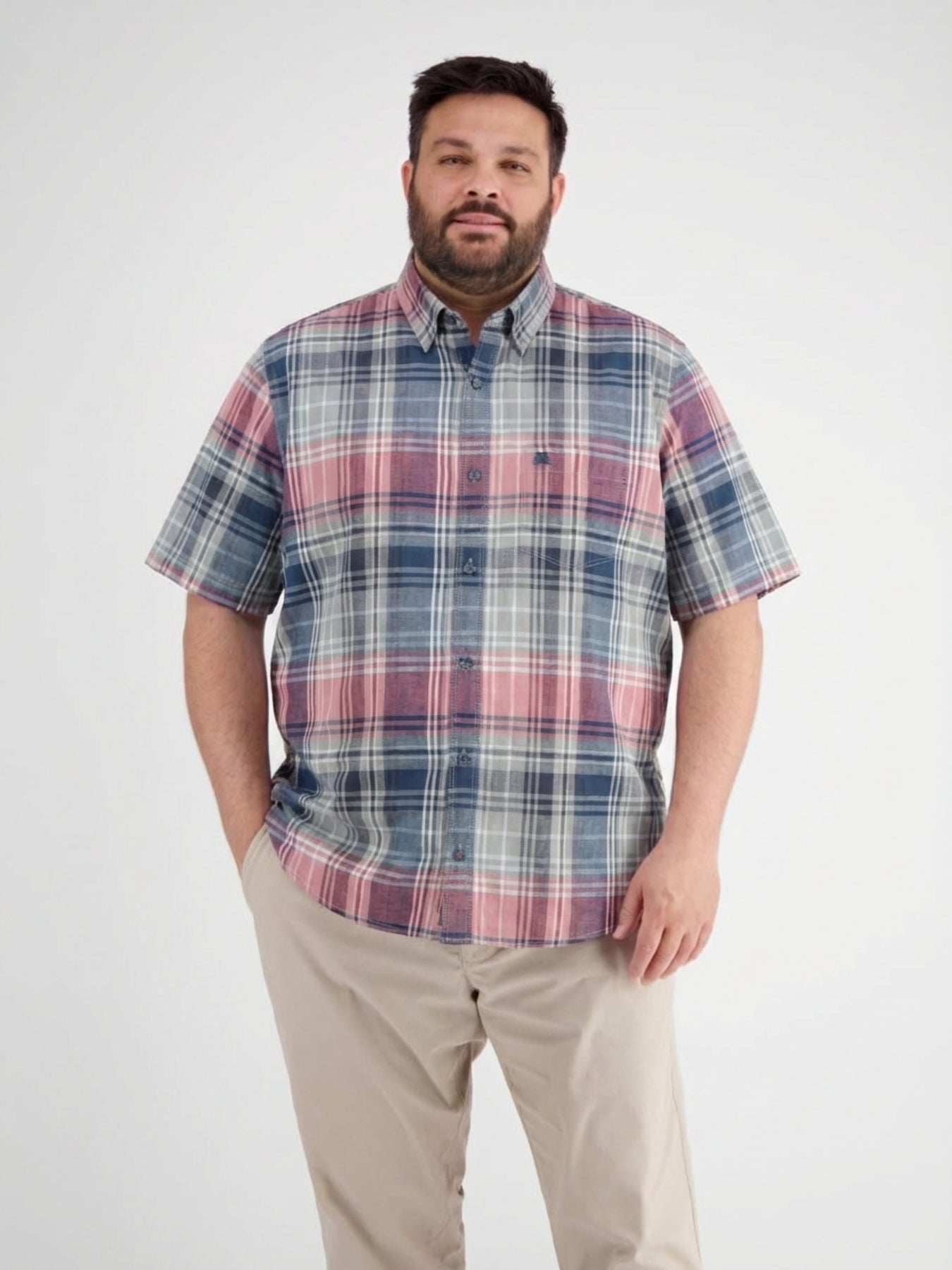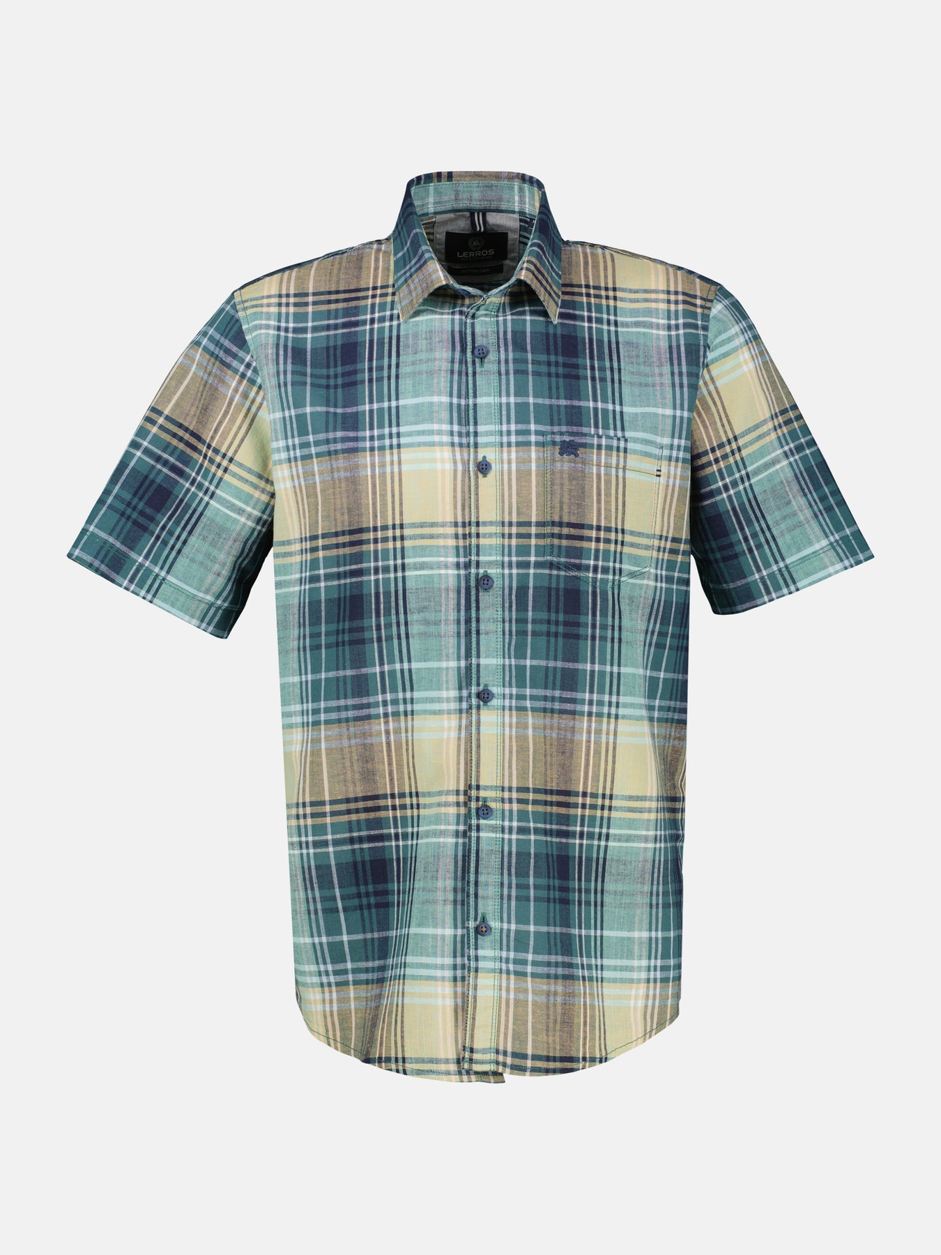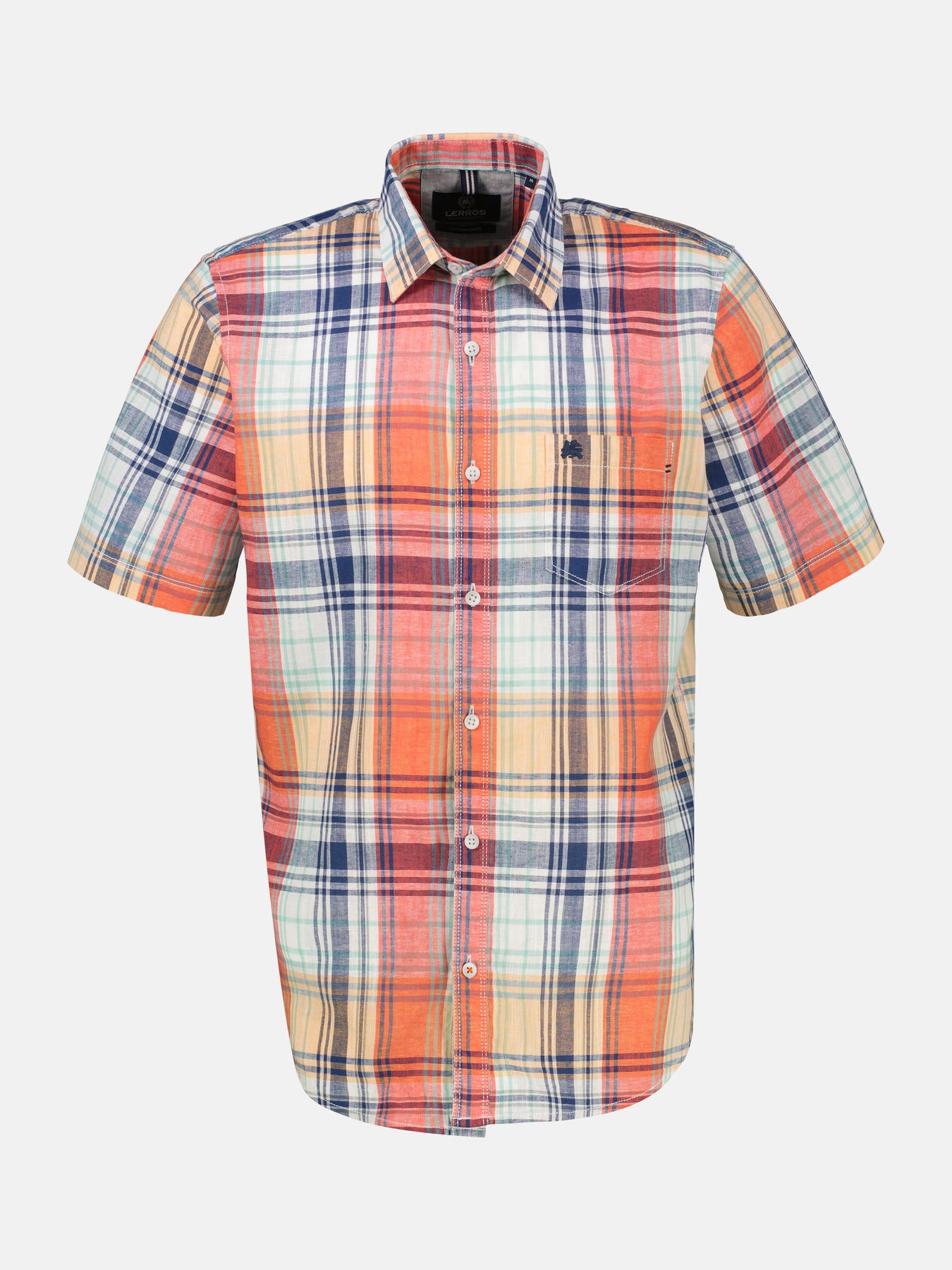 Checked short-sleeved shirt in plus sizes, made from cotton and linen. This checked LERROS short-sleeved shirt, available in sizes 3XL to 6XL, features fresh colors that are ideal for spring and summer wardrobes. The lightweight men's short-sleeved shirt feels comfortable against the skin, while the Kent collar and the precisely embroidered LERROS logo on the chest underscore the high-quality craftsmanship. The chest pocket completes this LERROS short-sleeved shirt, perfect for leisure time and relaxed evenings on vacation.Care: