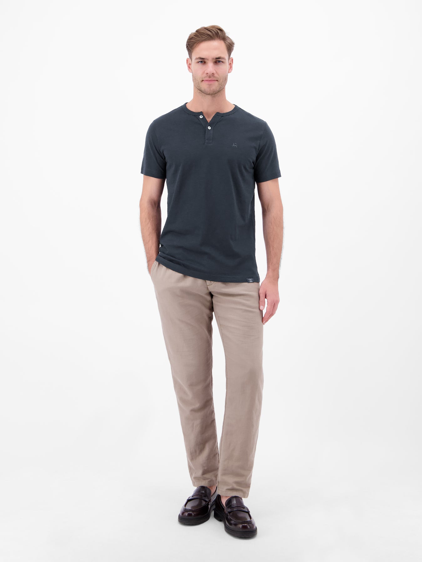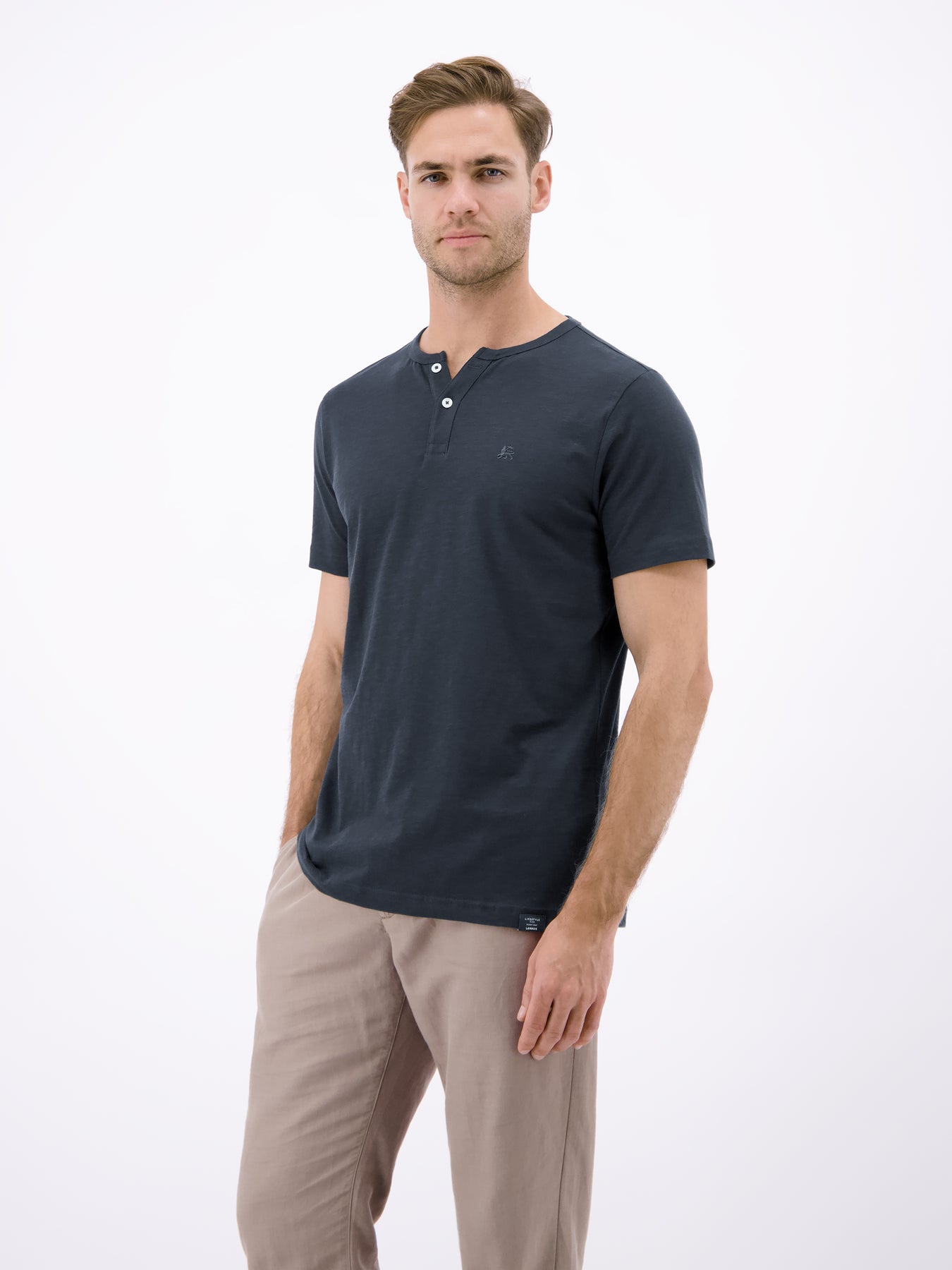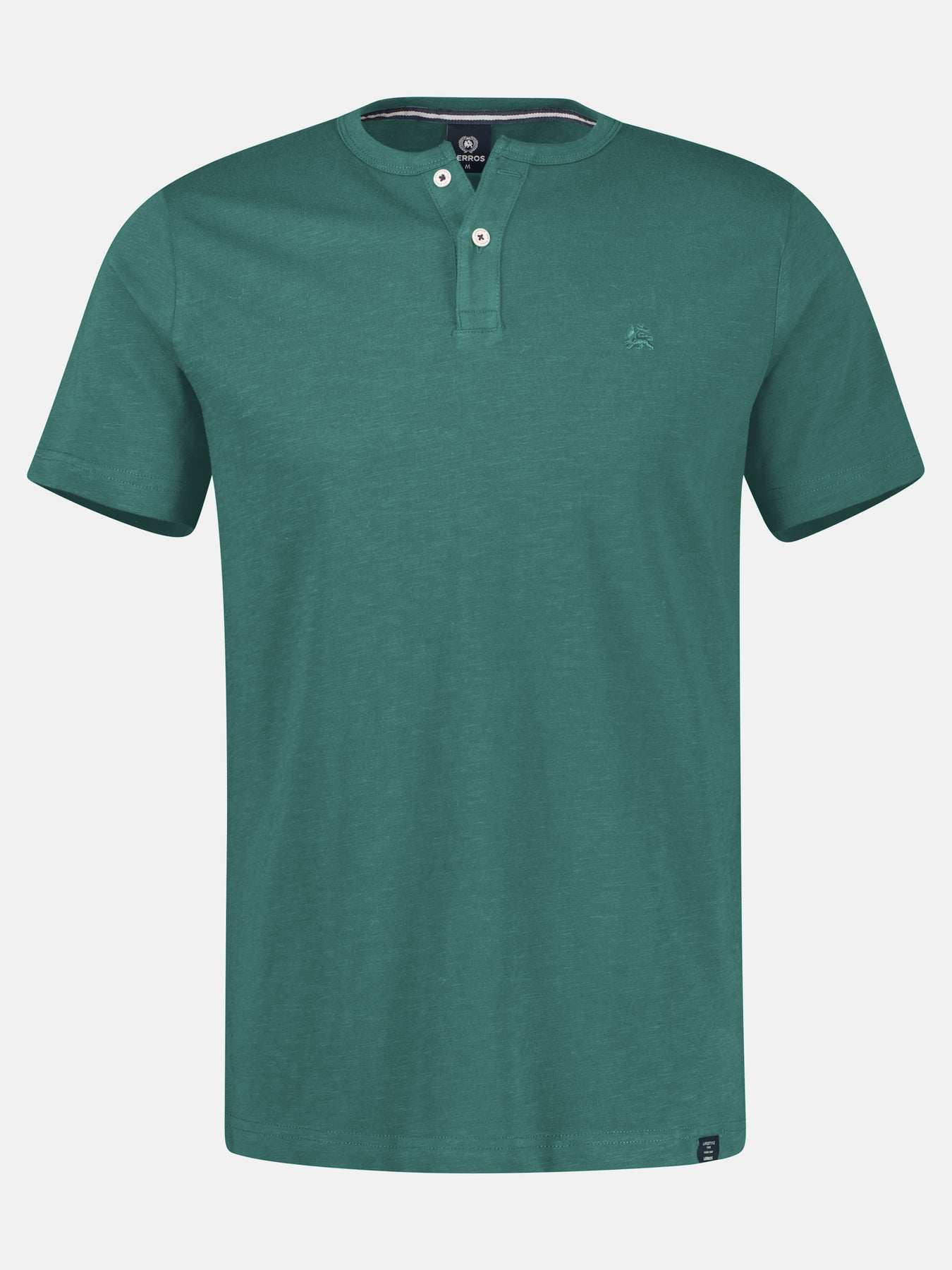 Round neck T-shirt with button placket made from 100% cotton. This solid-color LERROS T-shirt is exceptionally comfortable and a versatile companion for warm days. The soft, skin-friendly collar and practical button placket ensure freedom of movement around the neck. A LERROS logo stitching completes the casual look. Whether worn on its own or combined with a blazer, this T-shirt is an essential wardrobe must-have.Care:
