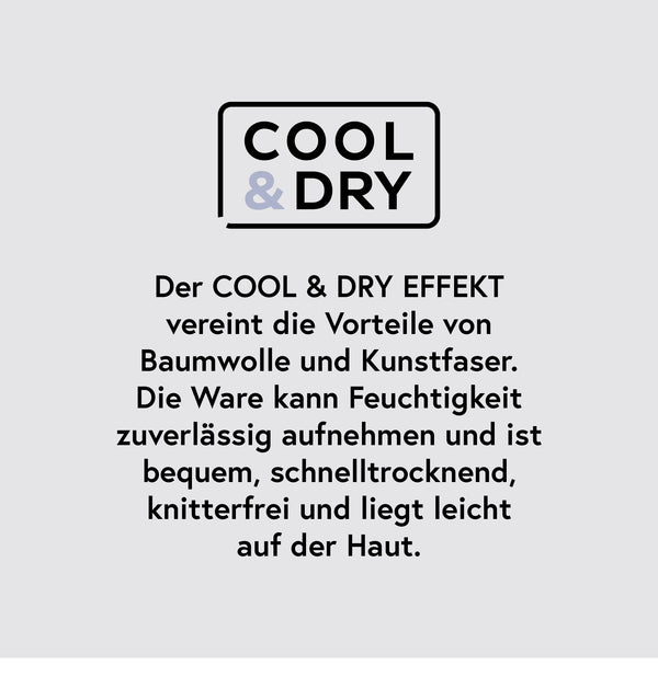 Der COOL & DRY EFFEKT vereint die Vorteile von Baumwolle und Kunstfaser. Die Ware kann Feuchtigkeit zuverlässig aufnehmen und ist bequem, schnelltrocknend, knitterfrei und liegt leicht auf der Haut.
