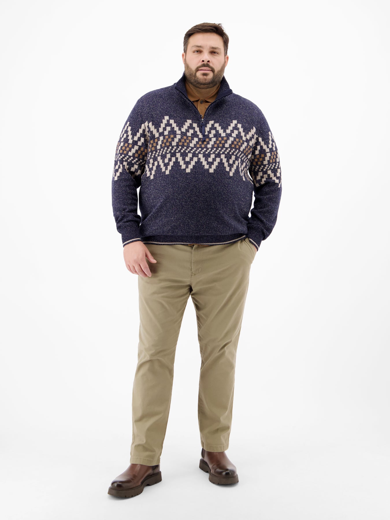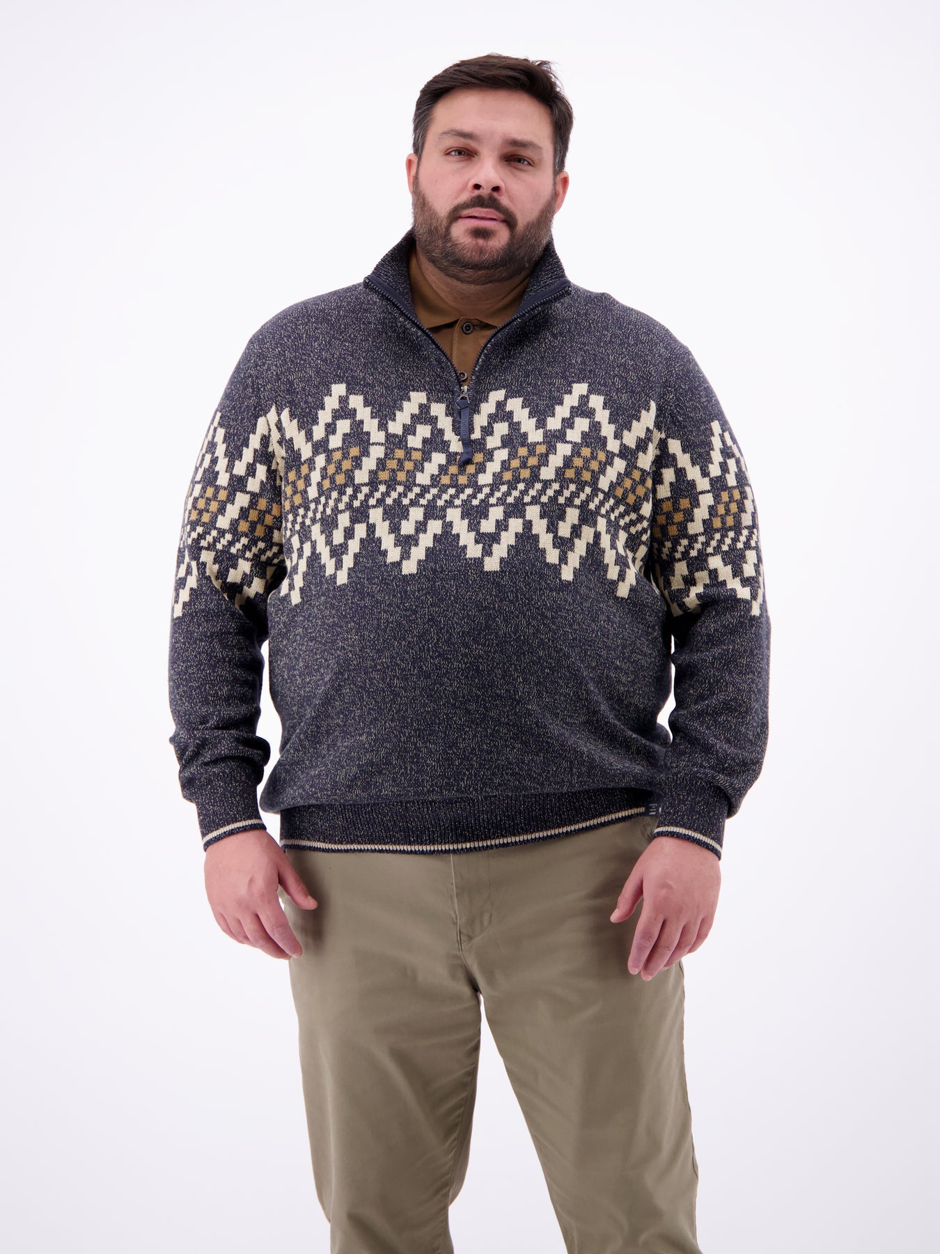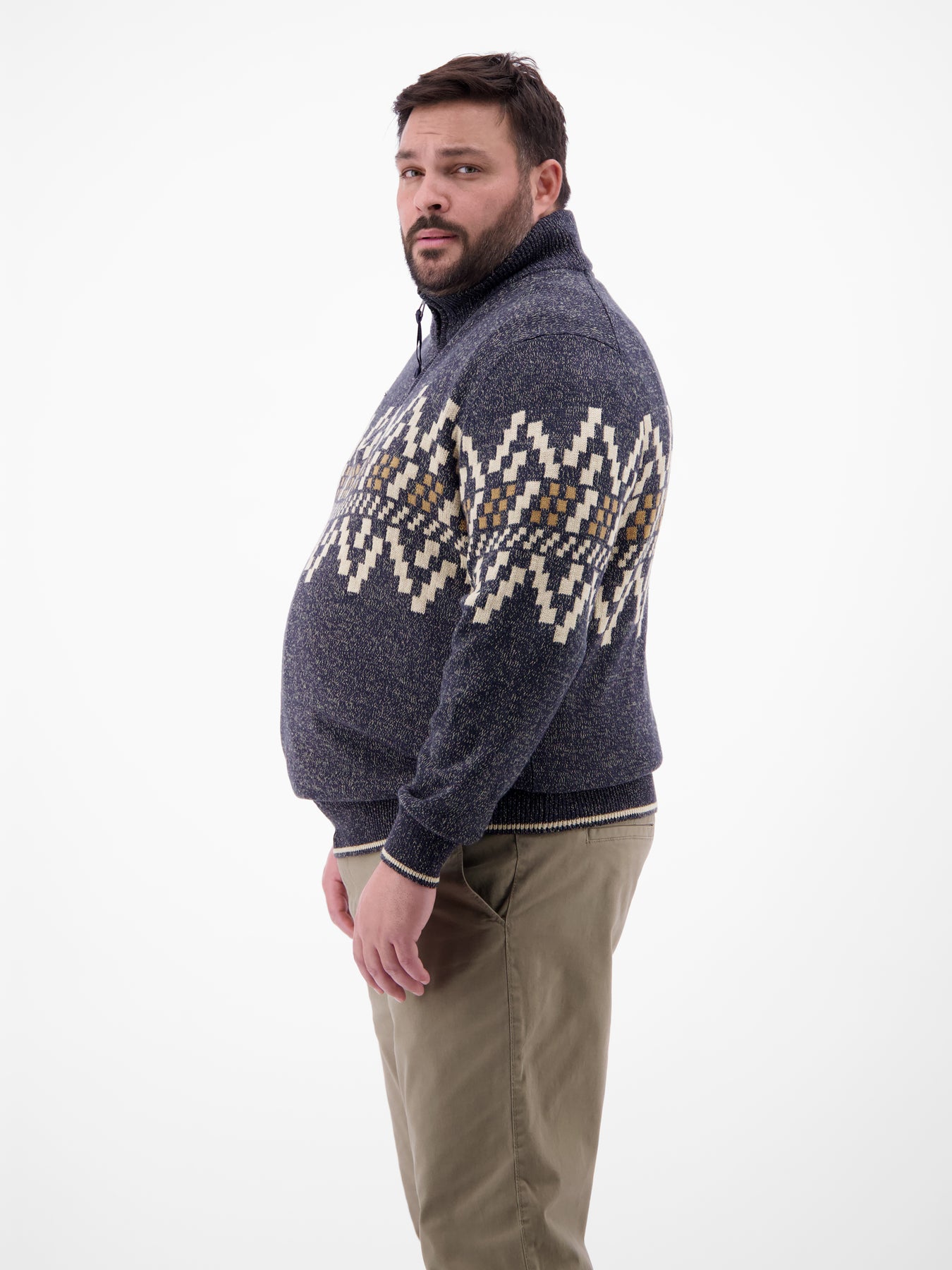 Auch in den Großen Größen 3XL bis 6XL - der LERROS Jacquard-Strickpullover überzeugt durch sein grafisch gestaltetes Norwergermuster und den funktionalen Troyerkragen. Der edle Look wird durch die hochwertige Materialqualität ergänzt, die für angenehme Wärme und Tragekomfort sorgt. Der Troyerkragen lässt sich je nach Bedarf hoch- oder runterklappen und schützt vor kühlerem Wetter. Ideal für den Übergang zwischen den Jahreszeiten oder als zusätzliches Layer in kälteren Monaten.Pflege: